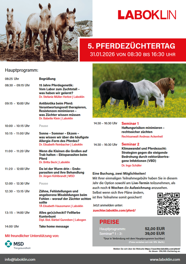Wir haben ein vielseitiges und interessantes Hauptprogramm (8:25 bis 14:00 Uhr) mit abwechslungsreichen Themen zu Genetik, Antibiotika und Antibiotikaresistenzen, Allergien (Sommerekzem), Ekto- und Endoparasiten, Zähne, Fehlstellungen und Missbildungen beim Fohlen sowie Fellfarben für Sie zusammengestellt. Das Programm finden Sie auf dem angehängten Flyer (einmal als PDF und einmal als TIF Datei) oder unter folgendem Link: