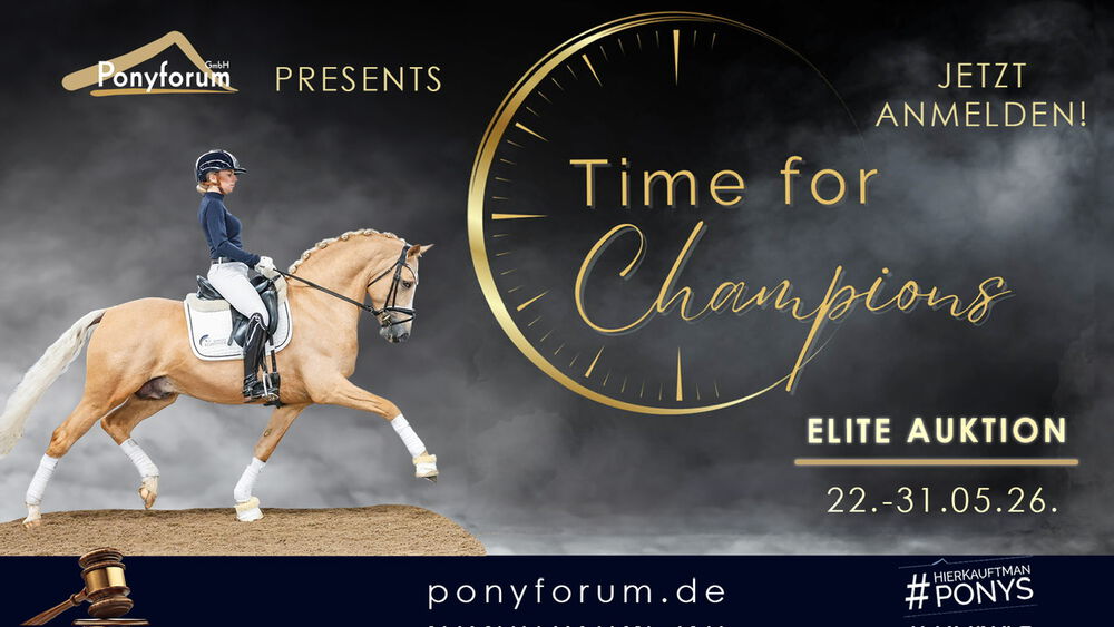 Marsberg, 10.04.2026 – Nach der Rekord-Premiere des Auktionsformats„Time for Champions“, das mit einer sensationellen Verkaufsquote von100 % und einem Durchschnittspreis von knapp 50.000,00 Euro neueMaßstäbe im Pony-Markt setzte, kündigt die Ponyforum GmbH dieFortsetzung an. Für die kommende Elite-Auktion vom 22.-31. Maiwerden ab sofort hochkarätige Dressurponys im Alter von 4 – 10 Jahrengesucht.