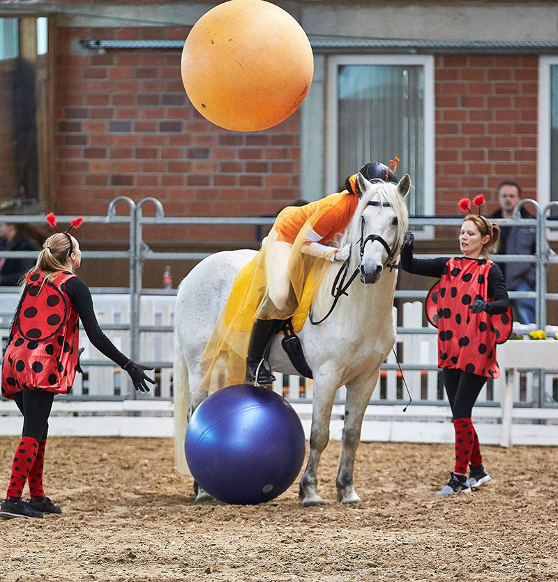 Eine vielseitige, bunte Hengstschau schloss sich an die Körung an. Geritten und gefahren zeigten sich Hengste „aller Größenklassen“ in anspruchsvollen Schaubildern. Von Connemaras, Welsh, Haflingern und Reitponys über Fjordhengste, Bretonen, Schwarzwäldern bis hin zu Karabagh-Hengst „Ada“ und zwei Friesenhengsten reichte die Spannbreite. Sogar erste Fohlen des neuen Jahrgangs (Partbred Shetland) waren zusammen mit ihrem Vater zu Gast. Aktive Hengststationen nutzen diese Möglichkeit zur Präsentation vor der Decksaison, so dass sich jeder Züchter einen Überblick verschaffen kann.