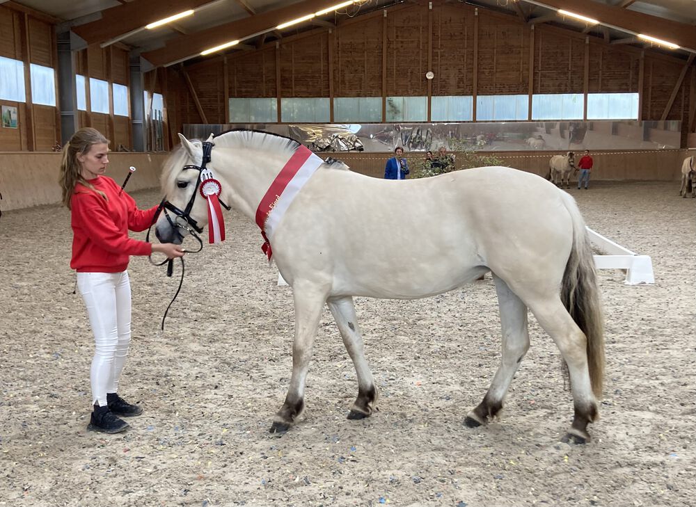 Alle Stuten konnten mit ziemlich guten bis sehr guten Noten überzeugen, was einmal mehr zeigt, auf welchem hohen Niveau sich die Zucht der Fjordpferde in Hessen befindet. 80% der ausgestellten Stuten erhalten den begehrten Prämientitel, was diese Qualität noch einmal untermauert.