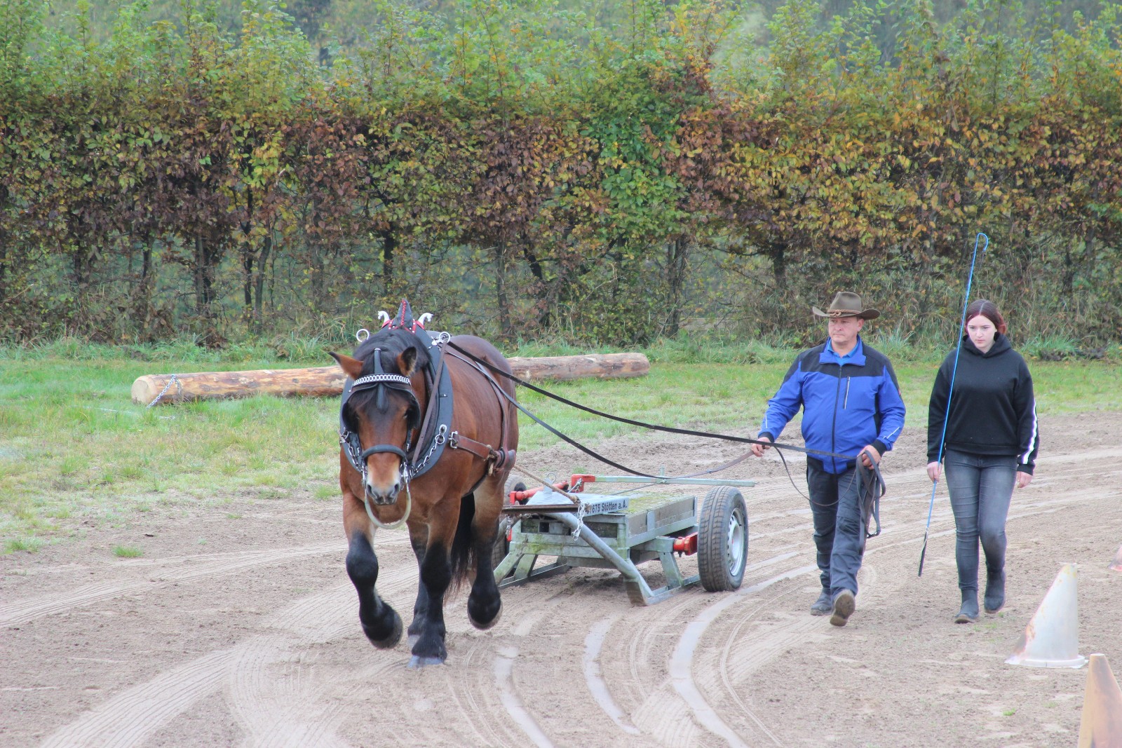 Pünktlich um 10 Uhr ging Vulkan (Rheinisch Dt. Kaltblut) v. Varus x Fänder in der EVI-Feldprüfung (ZR Ziehen, Fahren) im Schwachholzziehen an den Start. René Hartung stellte den bestens vorbereiteten Hengst sowohl in dieser Teilprüfung als auch im anschließenden schweren Zug vor dem Zugschlitten sehr gekonnt vor, sodass die Richter Wolfgang Benschus (Dillenburg) und Klaus Biedenkopf (Lich) auch entsprechend hohe Noten vergeben konnten. Die Fahranlage, die in einer Fahraufgabe vor der Kutsche zu absolvieren war, meisterte der Hengst hervorragend, sodass auch Fremdfahrer Andreas Müller (Erbach) diese mit sehr gut (9,0) bewertete. Am Ende stand eine beeindruckende Note von 8,40 auf dem Prüfungszeugnis, zu der man der Besitzerin Tanja Töpfer aus Eisenach und Fahrer René Hartung herzlich gratulieren konnte.